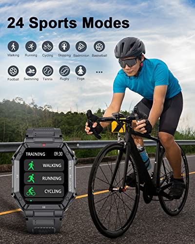 【24 Sportmodus Smartwatch Herren】 Multifunktionale military smart watch herren unterstützen 24 Sportmodi. Zum Beispiel Gehen, Laufen, Reiten, Klettern, Skifahren, Schwimmen, Basketball, Golf, Fußball und Baseball usw. Die Fitnessuhr kann die Trainingszeit aufzeichnen, den körperlichen Zustand, Schritte, Entfernung, verbrannte Kalorien und so weiter verfolgen. Militärische taktische intelligente Sportuhren sind absolut praktisch für Ihre Outdoor-Aktivitäten und Abenteuer.